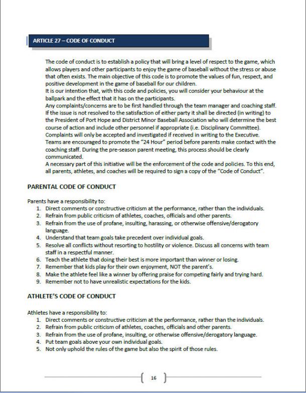 Article 27 from the Port Hope & District Minor Baseball Association Policies and Procedures